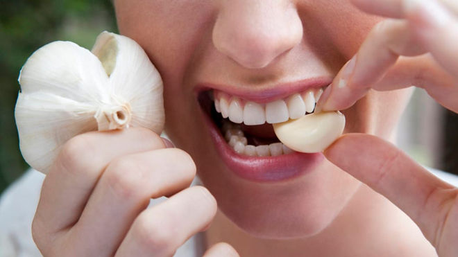 - Чеснок и лук. Всё, что необходимо делать – это употреблять в пищу как можно больше этих продуктов. Лук и чеснок отлично убивают многие виды вирусов и обладают антисептическими свойствами. В результате получится не только устранить зубную боль, но и ускорить процесс избавления от простуды.