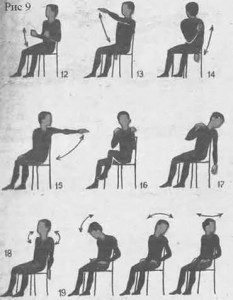 - Надо взять стул и сесть на него. Ладошки располагаются на талии, а локти разводятся в стороны. В таком положении надо осуществлять по 15 плавных синхронных вращений плечами.